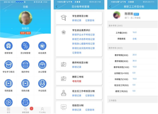 The Faculty APP can view school news, view students' moral education assessments and percentage assessment records, view students' comprehensive quality archives, students' overall learning situation (including grades, classroom performance, student archives, etc.), view and approve student leave requests, manage student attendance types, watch live and on-demand videos, view and grade online homework submitted by students, view their own schedules and student ratings for each class, view their own pay stubs, etc.