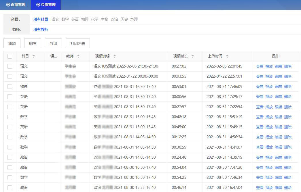 Teaching System (Schedule Management, Class Time Schedule Settings, Teaching Effectiveness, School-based Resources, Question Bank Management, School Error Book, Student Error Book, Knowledge Point Management, Knowledge Point Map, Online Homework, Exam Score Management, Student Score Query, Live Broadcast Management, Video-on-Demand Management)